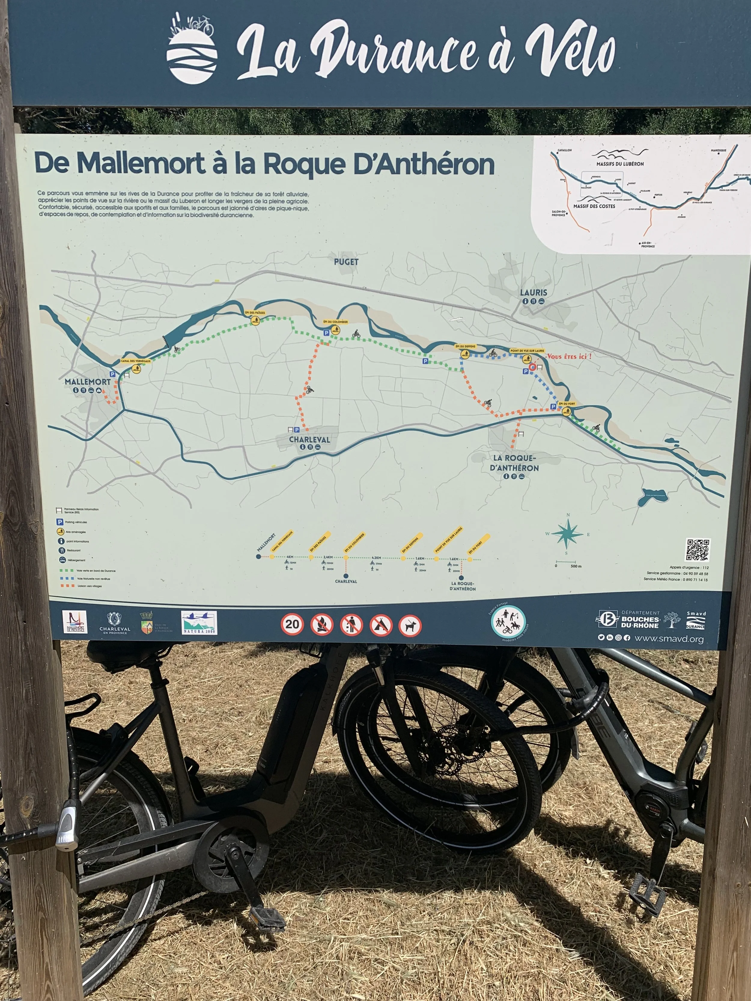 Total distance: 24 km (15 miles) Lourmarin to la Roque d’Antheron 14 km approx; La Roque d’Antheron to Malemort 10 km approx (downhill out of Lourmarin, then route is flat along the river)