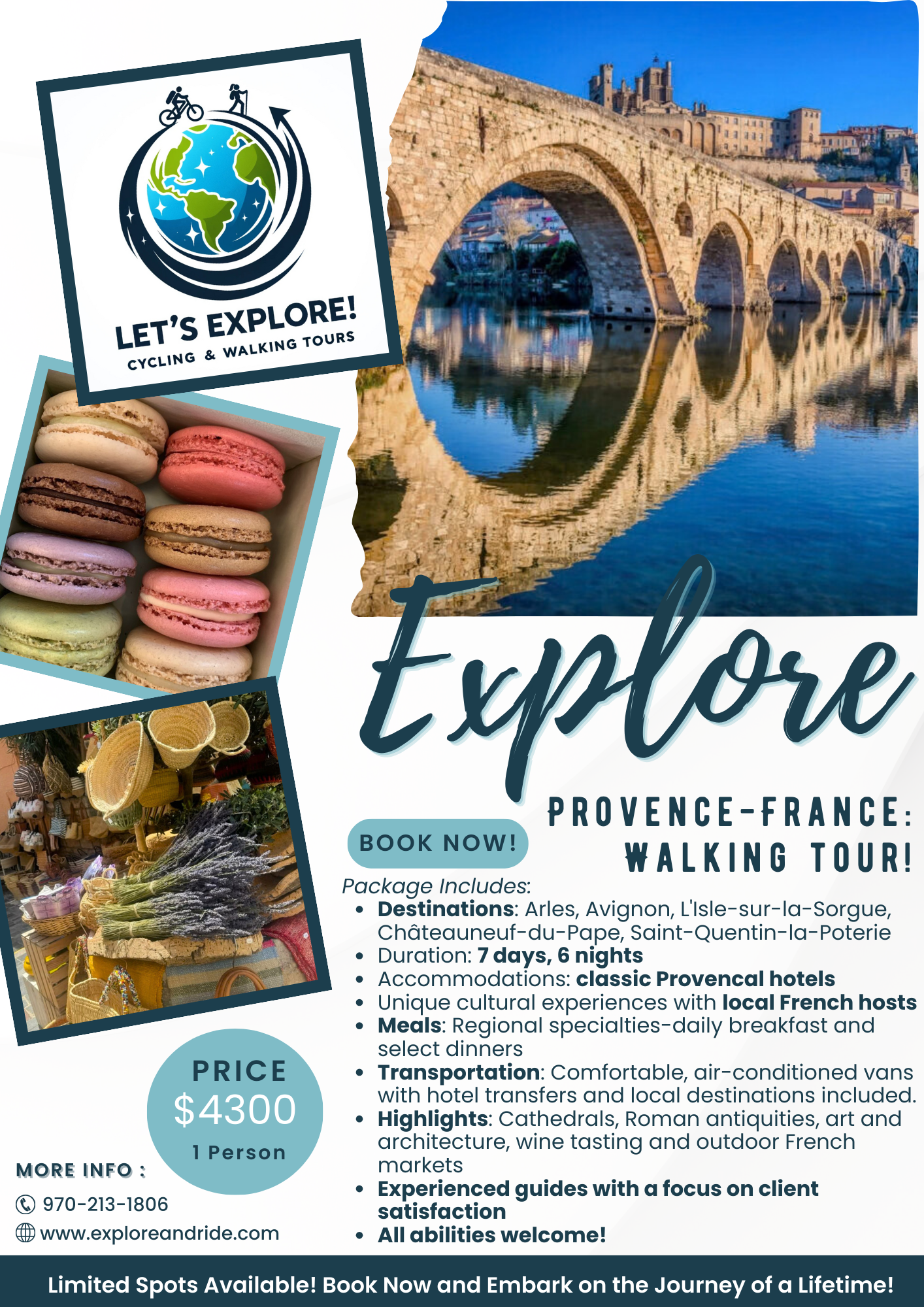 Custom trips are curated experiences, ranging from brewery tours in Colorado to personalized cycling, walking, and all-inclusive stays in France. Pricing for these trips will vary according to group size and services provided by Let’s Explore LLC! We will therefore work with you and /or your group to determine pricing structure.